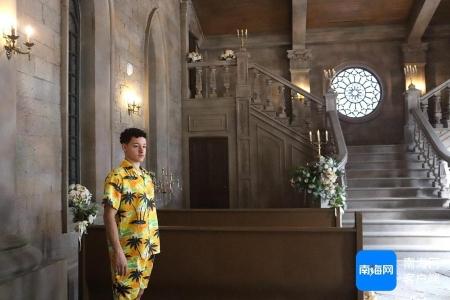 Harvey身着岛服在影视基地打卡拍摄。海南国际传播中心供图