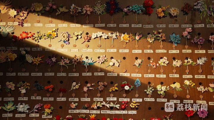 金黄的银杏、洁白的茉莉、粉嫩的桃花……在南京甘熙故居内的一处深幽厅房,彰显着四季之美的绒花同时在一面古朴的深色墙面上盛放,引来游人的注目。这似乎也是绒花自身发展的生动隐喻,历经千年的喧嚣,它们依旧花开不败,绽放出夺目的光彩。