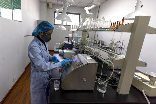 ↑11月28日,质量检测人员桑吉在实验室检测产品质量。