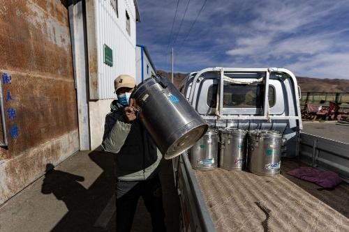 ↑11月28日,牧民次仁顿珠在收奶站搬运奶桶。