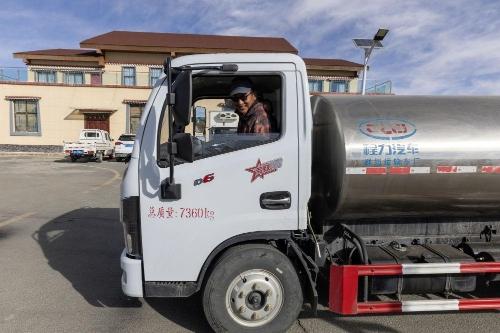 ↑11月28日,驾驶员用罐车将巴氏杀菌后的新鲜牦牛奶运往拉萨市场。