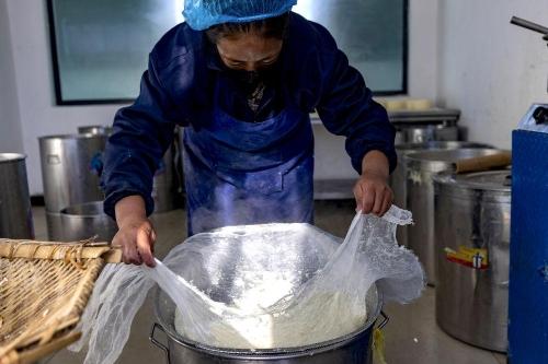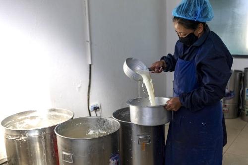 ↑11月28日,在基地就业的当地员工索朗卓玛在用传统工艺制作奶渣。