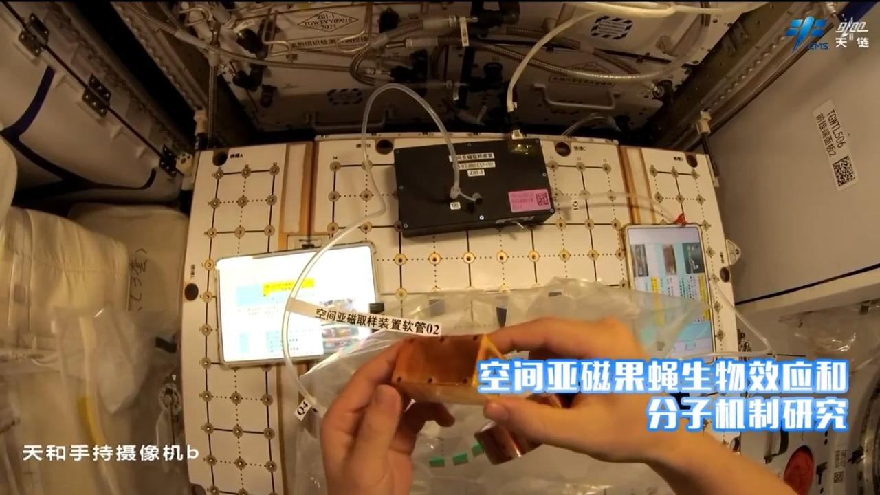 上周,在问天实验舱内,科学实验柜中的多项实验同步开展。航天员完成了“协调高效的蛋白质结晶实验”、组织与细胞培养等实验的操作与处置。航天员还开展了生命生态实验柜内果蝇转移、收集、气体净化组件更换等操作。
