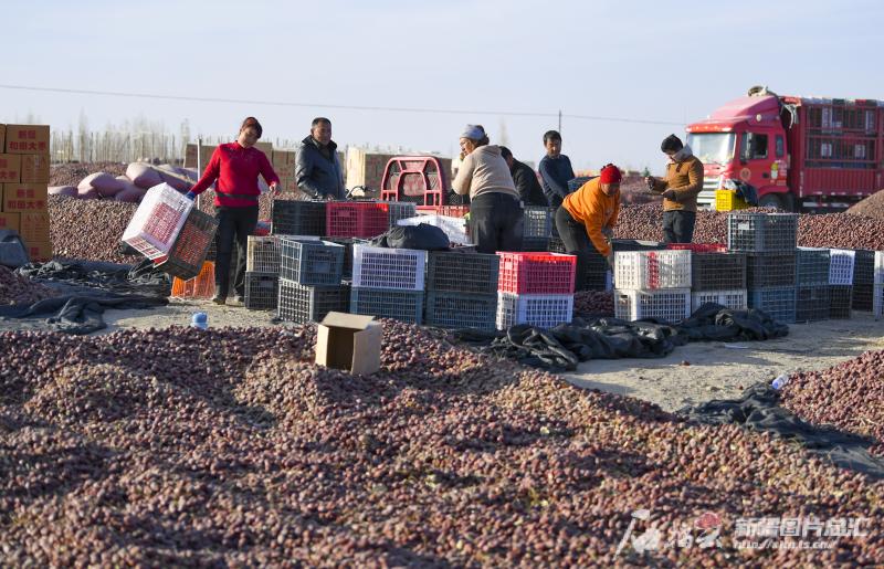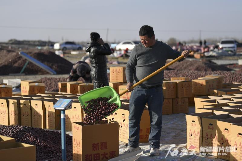 11月29日,农民在晾晒场将晾晒好的红枣装箱。