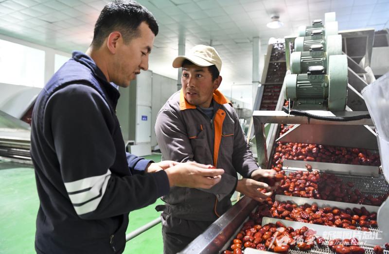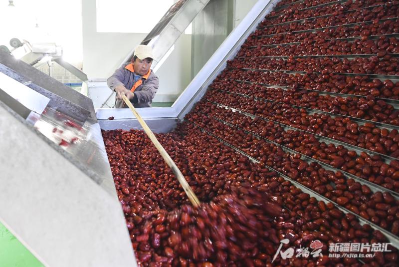 11月29日,策勒县智慧果业农民专业合作社员工在烘干车间作业。