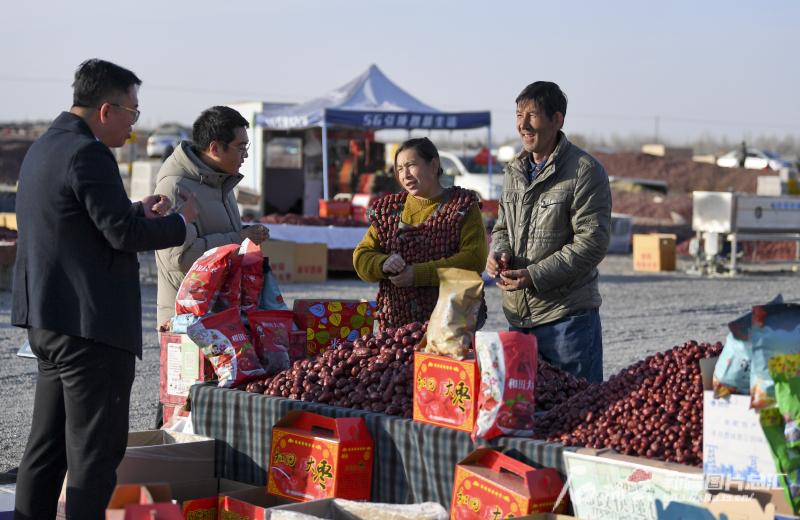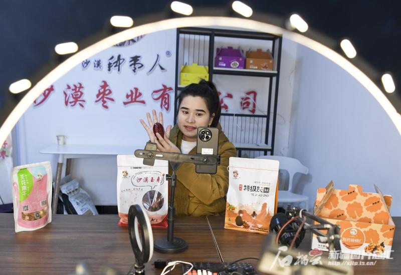 11月29日,策勒县智慧果业农民专业合作社员工在直播销售大枣。