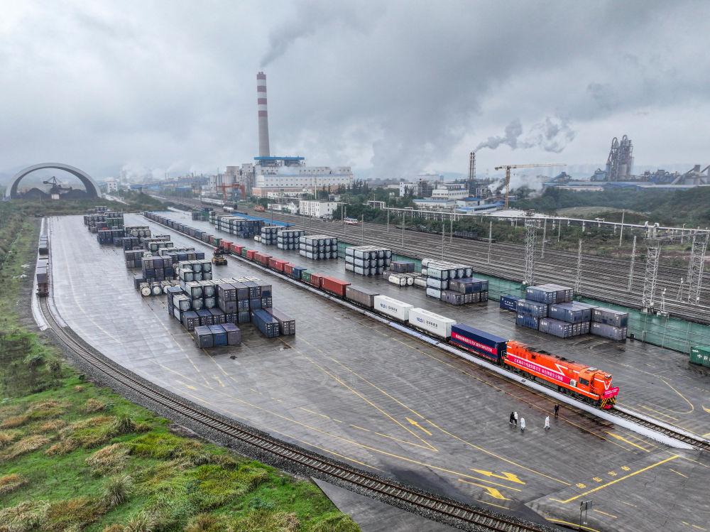 11月19日,重庆市动力锂电池全国铁路试运首发班列在重庆长寿渝巴专用铁路等待发车(无人机照片)。新华社记者 唐奕 摄
