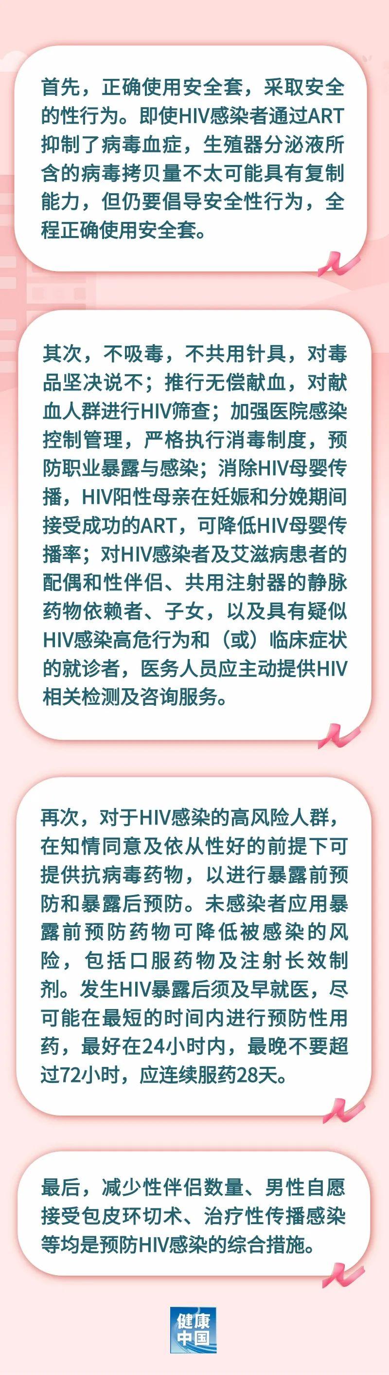 是指采用ART降低血浆HIV病毒载量,从而将HIV传播风险降到最低。数项研究表明,当HIV感染者采用ART获得了持久的病毒抑制后,其传播HIV给未感染性伴侣的风险可忽略不计。多项观察性研究分析了异性恋单阳配偶,结果也表明ART能有效降低将HIV传播给未感染方的风险,表明ART作为预防措施具有重要作用。