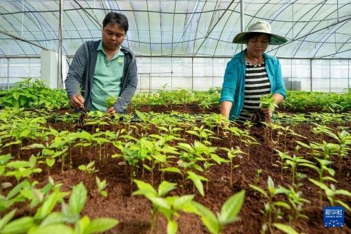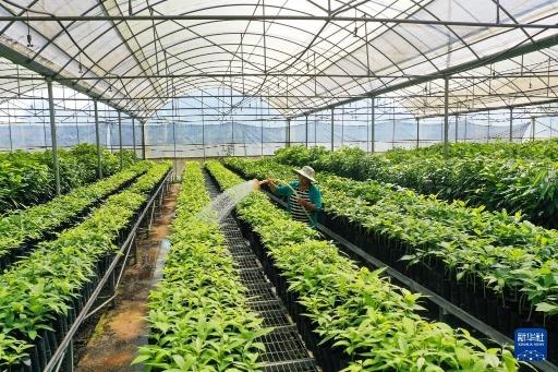 两名工作人员在普洱绿银生物股份有限公司的牛油果种苗基地打理种苗(10月28日摄)。新华社记者 陈欣波 摄