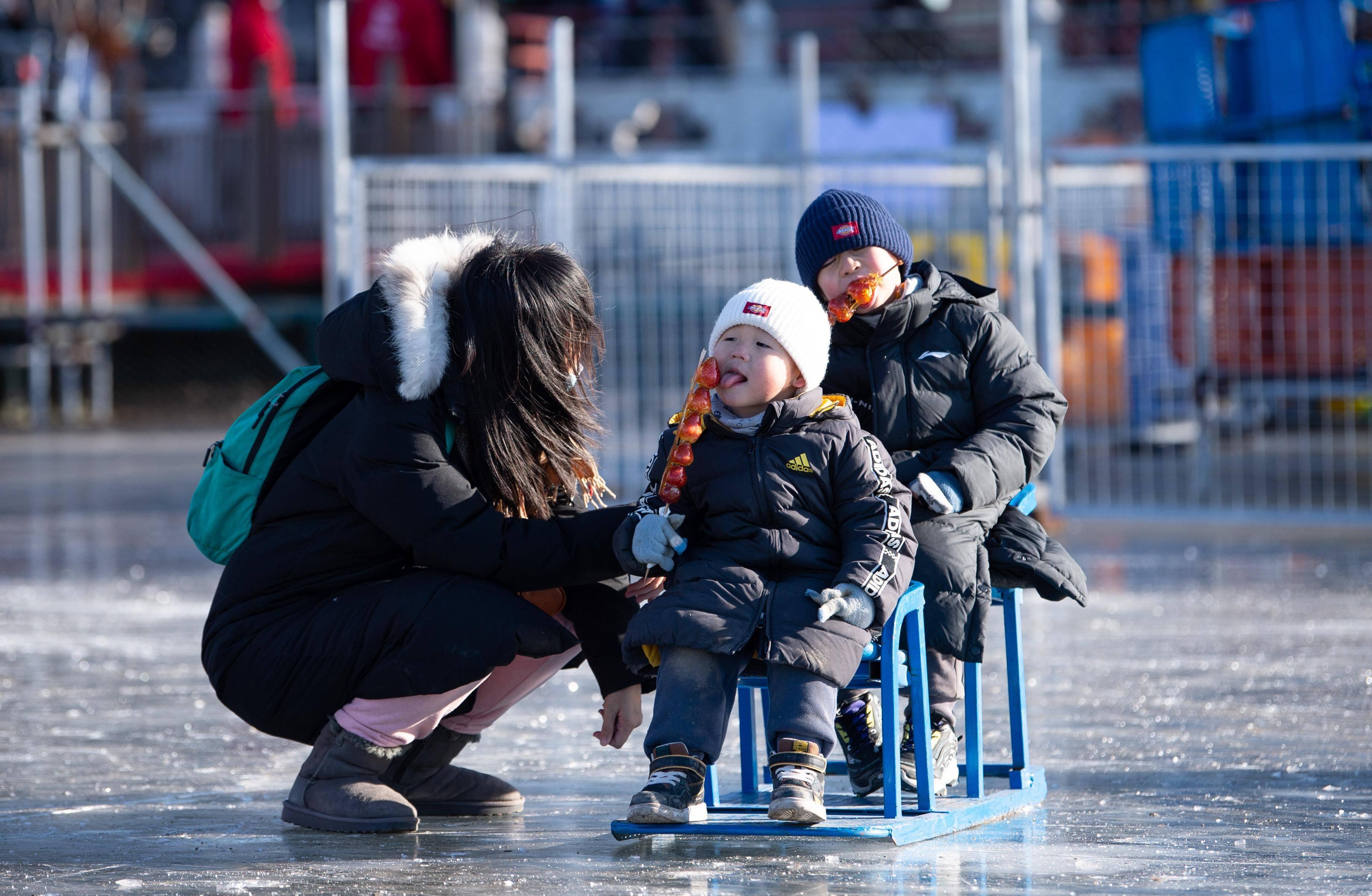 在北京什刹海冰场,小朋友坐在冰车上吃冰糖葫芦。 新华社记者 陈钟昊 摄