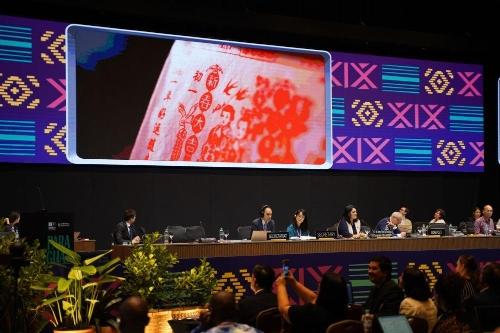 12月4日,在巴拉圭亚松森联合国教科文组织保护非物质文化遗产政府间委员会第19届常会评审现场,大屏幕播放春节宣传视频。新华社记者朱雨博 摄