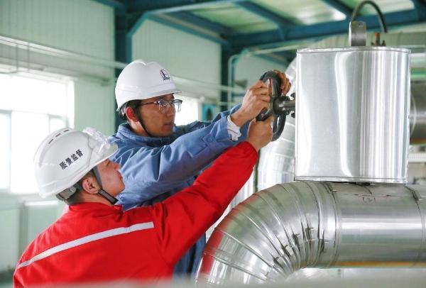 2024年2月22日,在新疆库车市,中国石化新星新疆绿氢新能源有限公司工作人员对设备进行巡检。新华社发(吐尔松·托胡提 摄)
