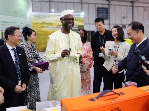 12月6日,在位于沙特阿拉伯利雅得的《联合国防治荒漠化公约》第十六届缔约方大会(COP16)中国馆,《公约》秘书处执行秘书易卜拉欣·蒂奥(中)品尝枸杞原浆饮品。新华社记者王东震 摄