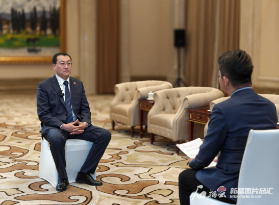 哈萨克斯坦贸易和一体化部副部长凯拉特·托列巴耶夫(左)接受中国新疆媒体记者专访。天山网-新疆日报记者范琼燕 摄