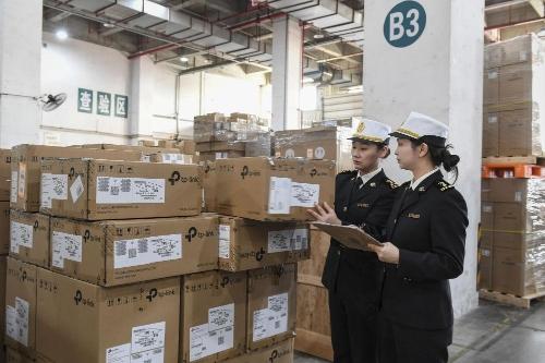 2024年11月27日,蛇口海关关员在深圳前海综合保税区一处仓库查验即将出口的货物。2024年以来,深圳港集装箱吞吐量保持高位运行,经营业绩持续向好,重箱比例连续3年呈现逐年上升趋势,货物结构持续优化,实现“量质齐飞”。