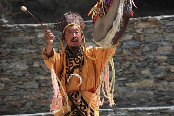 随着悠扬的羌笛声响起,德高望重的"释比"头戴猴皮帽,手持法器,神情庄重地走在队伍最前面,其他族人紧跟其后,一起向神坛献上鲜花和青稞酒。