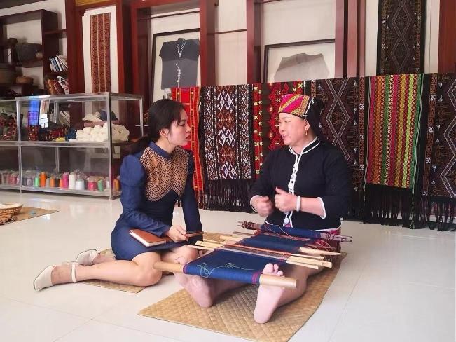 黎族传统纺染织绣技艺国家级传承人刘香兰(右)正在和陈孟丽(左)交流。 受访者供图