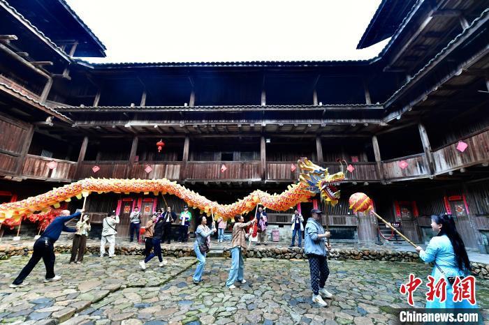 12月4日,福建省南靖县,海外华文媒体代表走进世界文化遗产地感受土楼魅力。图为海外华文媒体代表在田中赋土楼群体验舞龙。中新社记者 张斌 摄