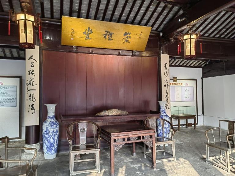 现存的徐霞客故居共有三进。据介绍,上世纪70年代修复时,专家们在大厅主柱下发现了清代顺治铜钱,推断这栋建筑虽然在战乱中被烧毁,但在清代初年进行过大修,部分保持了明代建筑特色。徐霞客故居第三进为徐家正厅,也就是崇礼堂,这里是徐家招待重要宾客和举办婚丧大事的场所。崇礼堂共有三级台阶,采用楠木庭柱,柱础高大,造型古朴。
