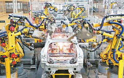 十二月十日,在理想汽车常州基地焊装车间,机械臂在对车身进行自动化焊接。陈暐 摄(人民图片)