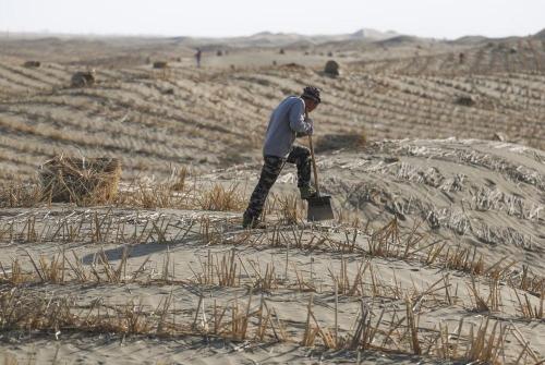 “铺好方格沙障,再种植沙生植物,逐步攻下沙化土地,实践证明行之有效。”民丰县林业和草原局副局长贾磊说,当地先后尝试了树枝、稻草、棉花杆等9种材料,无数次试验最后才选择芦苇铺设方格沙障,“成本低,施工快,效果好”。