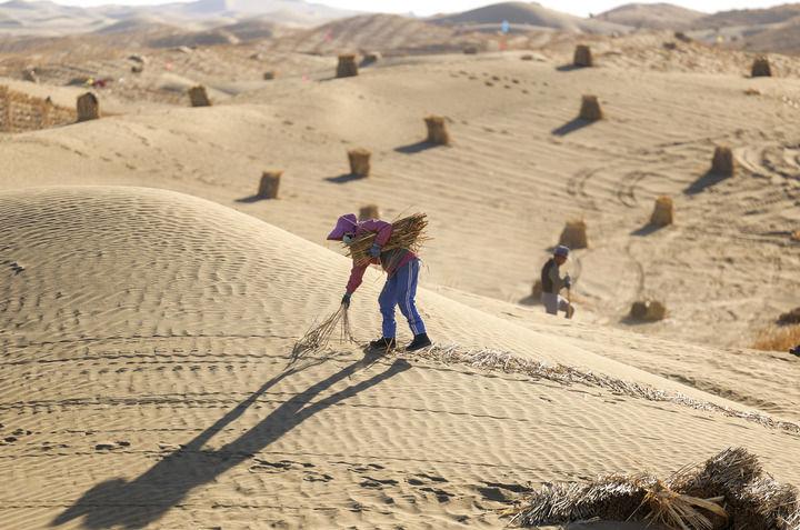 在民丰县,全县5.67万平方公里国土面积中,沙漠占3.2万平方公里。站在民丰后河坝眺望,铺好的草方格犹如一张金色大网,缚住了连绵起伏的沙丘。