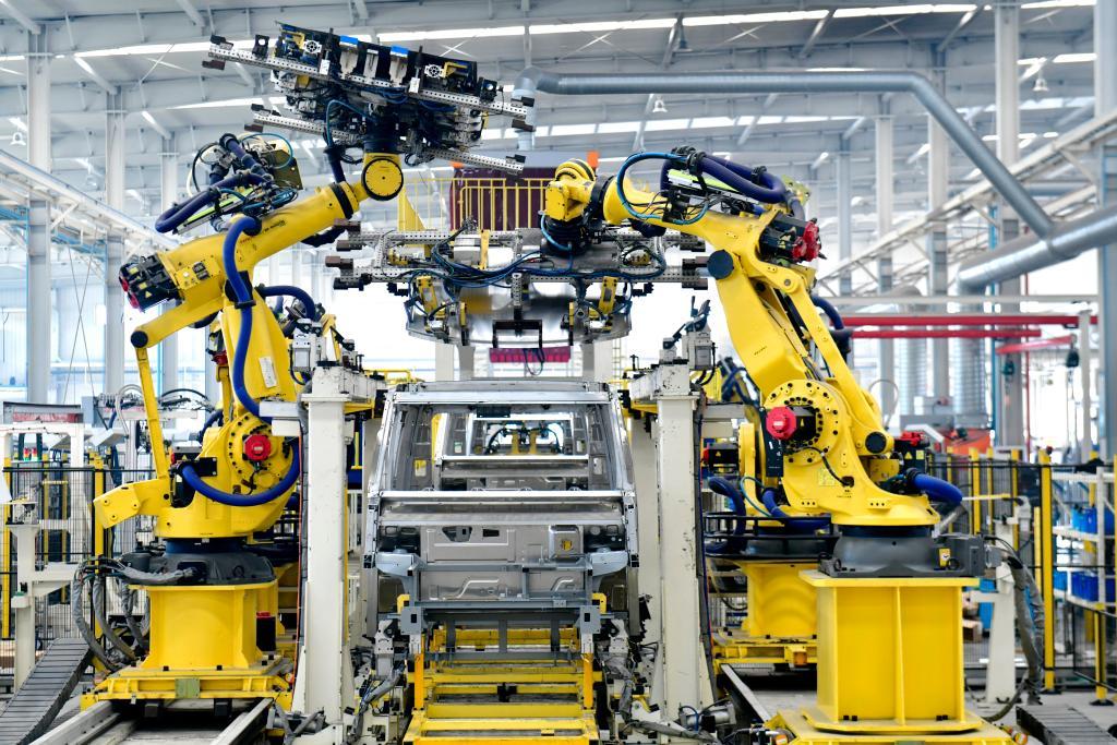 11月7日,在山东邹平魏桥轻量化基地宏奥全铝车身集成生产车间,工业机器人在流水线上作业。新华社记者 郭绪雷 摄