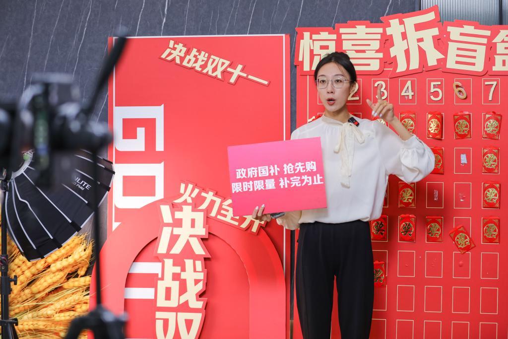 11月11日,主播在山东省青岛市李沧区深广互动直播基地内直播介绍家电“以旧换新”政策。新华社发(张鹰 摄)