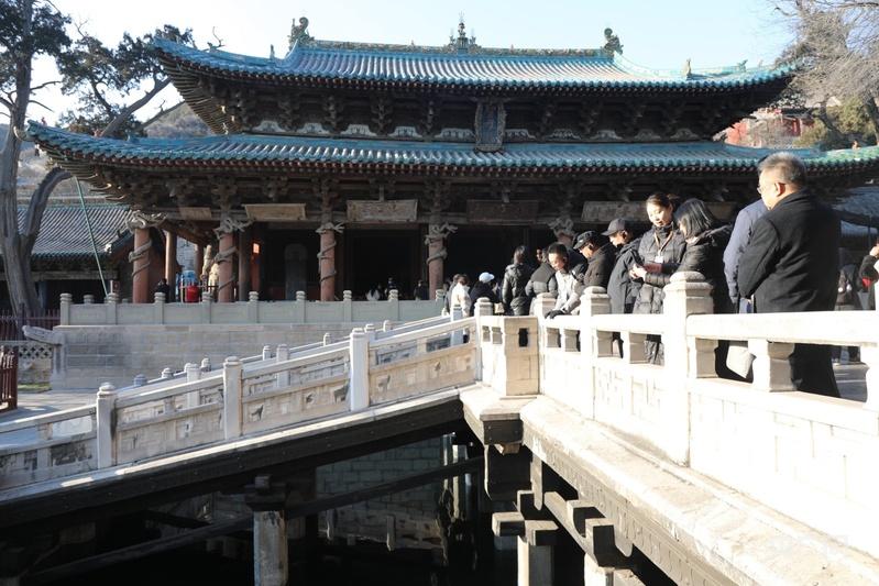 中国最早的水陆立交桥——鱼沼飞梁。鱼沼飞梁西依圣母殿,东邻献殿,初建在北魏之前。飞梁的形式古朴,横跨于鱼沼之上,借以观赏景物,南北东西四面伸长,如鸟之振翼欲飞状,是中国少有的一种十字桥梁形式,被誉为中国最早的水陆立交桥。