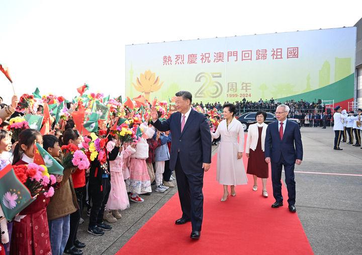 欢送仪式上,澳门少年儿童向习近平和夫人彭丽媛献上鲜花。习近平和夫人彭丽媛同前来送行的人员一一握手,向欢送队伍挥手道别。