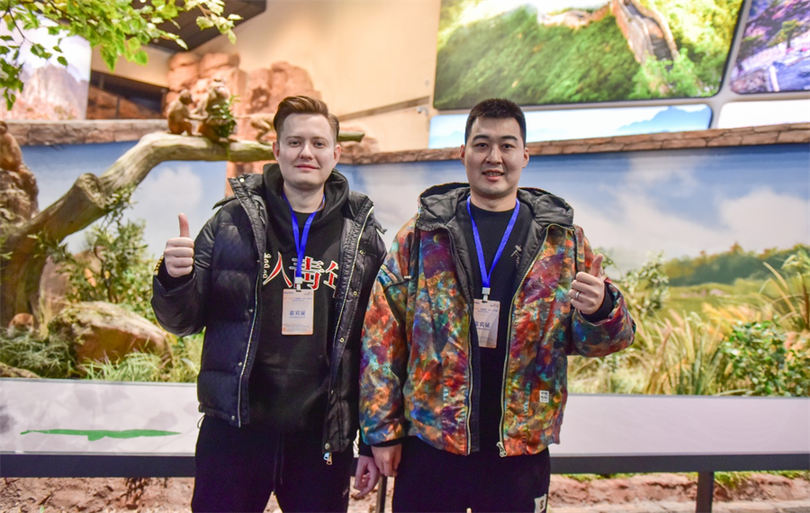 俄罗斯网红安特(左)和中国网红庞粟日(右)打卡中国古动物馆(保定自然博物馆) 摄影 张瞬晗