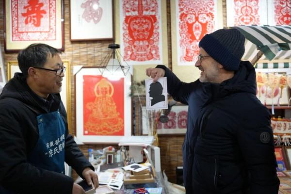 濉溪古城剪纸艺人仅用几分钟就为英国专家林柏瑞(右)剪出了一幅肖像画 摄影 曲艺