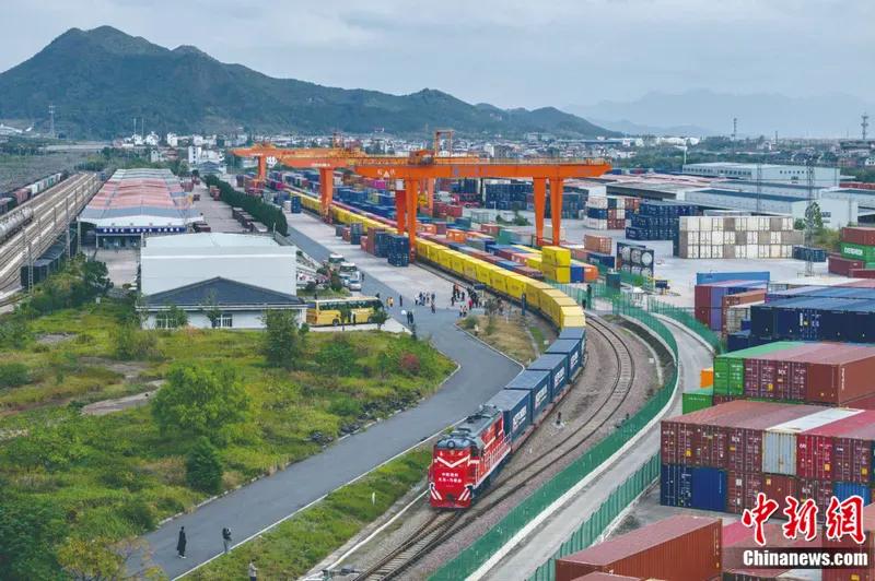 11月18日,“义新欧”中欧班列从铁路义乌西站鸣笛启程,驶往逾1.3万公里外的西班牙首都马德里。当天,“义新欧”中欧班列迎来开行10周年节点。金华市新闻传媒中心供图