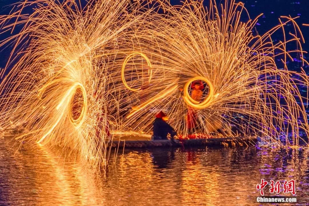 义乌佛堂“十月十”民俗文化节期间,江面铁花飞溅,如烟花般绚烂绽放。义乌宣传部供图