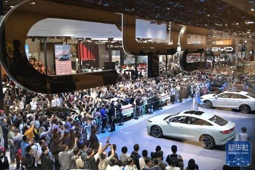 在2024(第十八届)北京国际汽车展览会上,参观者在比亚迪品牌展台参观(2024年5月4日摄)。新华社记者 尹栋逊 摄