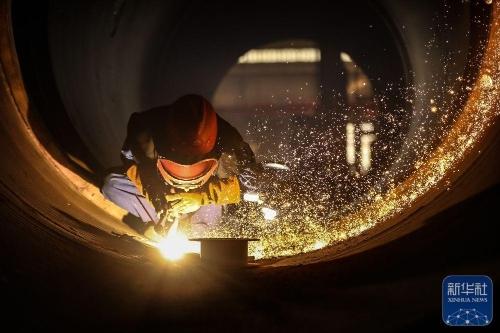 工人在兰州新区兰石集团高端装备产业园车间内开展焊接作业(2024年11月6日摄)。新华社记者 郎兵兵 摄