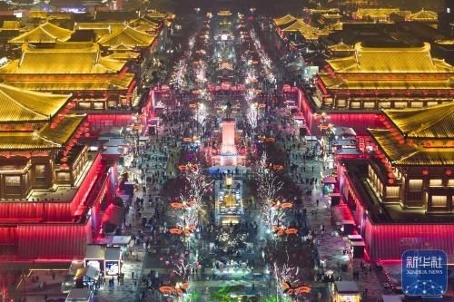 游客在西安大唐不夜城游玩(2024年2月2日摄,无人机照片)。新华社记者 邵瑞 摄