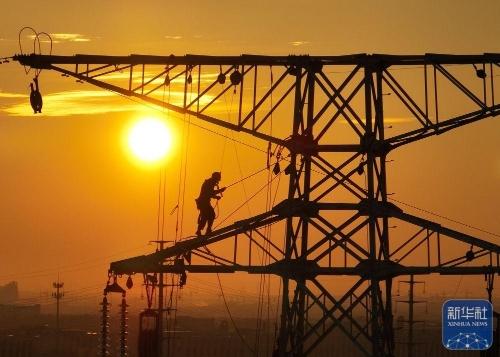 在浙江省杭州湾上虞经济技术开发区,220千伏绍嘉输变电工程施工人员开展放线作业(2024年8月6日摄,无人机照片)。新华社记者 翁忻旸 摄