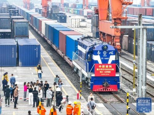 第10万列中欧班列—X8083次中欧班列(重庆—杜伊斯堡)在重庆团结村站准备发车(2024年11月15日摄,无人机照片)。新华社记者 唐奕 摄