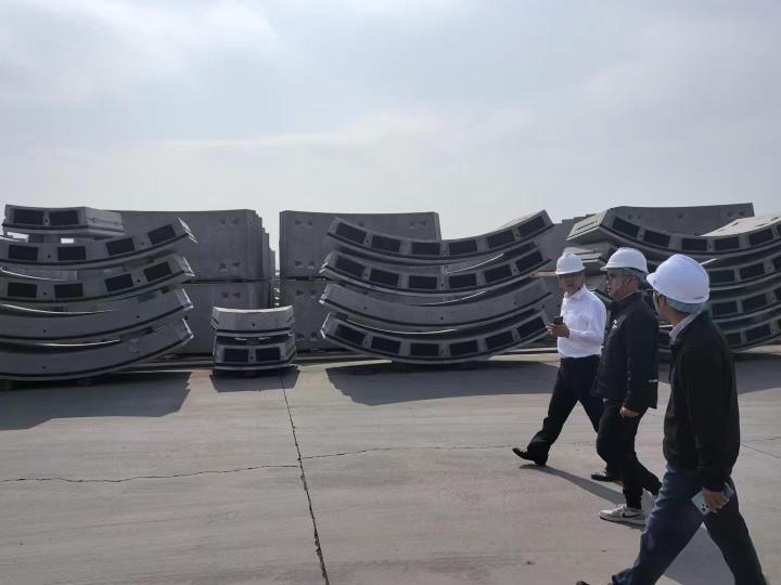 郭炽涛(中)对接参观某工程项目的材料供应商。