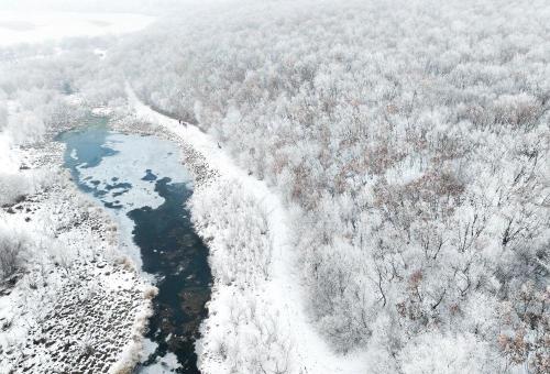 这是11月14日在莫力达瓦达斡尔族自治旗拍摄的雪后雾凇景观(无人机照片)。新华社记者 连振 摄
