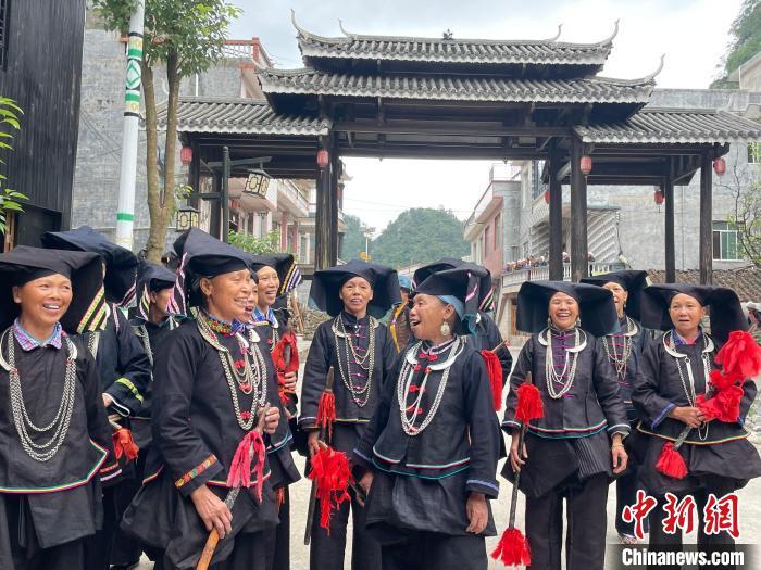 近日,在广西那坡县,“黑衣壮”民众唱起山歌迎客。黄令妍 摄