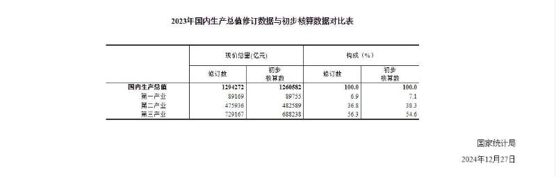 依据我国国内生产总值(GDP)核算制度和第五次全国经济普查结果,并同步实施城镇居民自有住房服务核算方法改革,国家统计局对2023年国内生产总值初步核算数进行了修订。