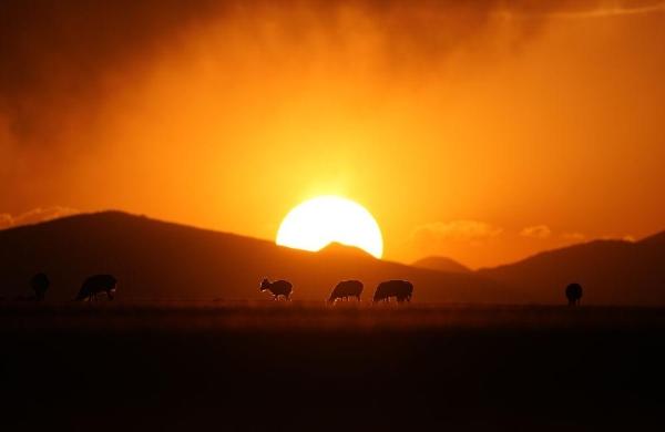 这是2024年6月16日拍摄的晚霞中鲁确塘草原上待产的国家一级保护动物藏羚羊。