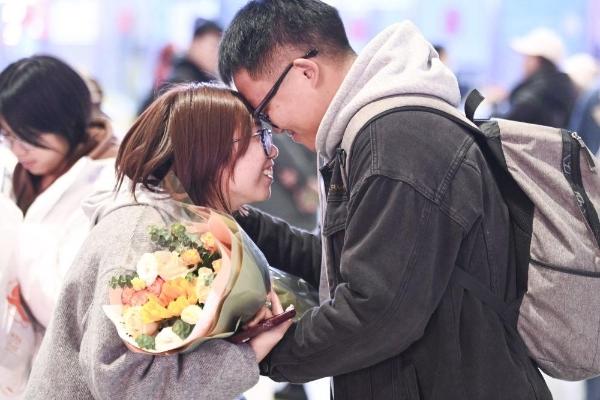 2月5日,在广西柳州站出站口,一名接站者与刚出站的女朋友碰头互动。