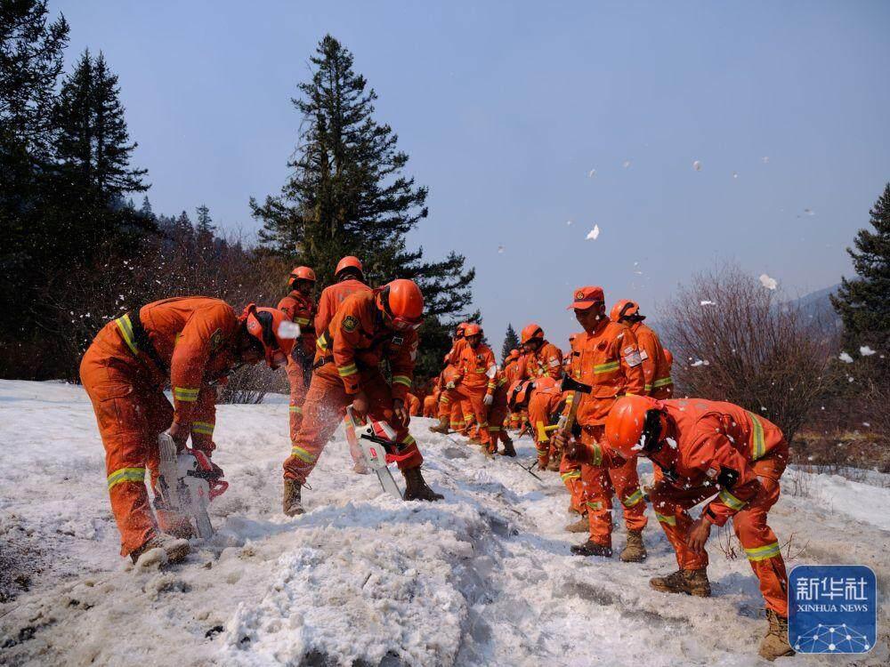 雅江县2号火场东北线,消防员在八角楼乡同达村为救援车辆破冰开路(3月17日摄)。
