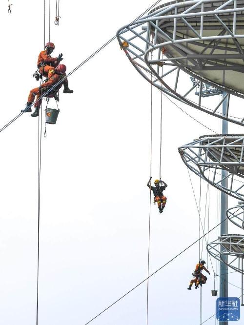 在成都举行的一场救援技术交流赛中,救援人员参加绳索救援技术比赛(10月15日摄)。