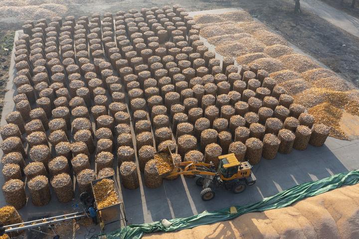 2024年11月13日,在黑龙江省肇东市一处秋粮晾晒场,海城双丽现代农机专业合作社的农民驾驶农机堆放玉米(无人机照片)。新华社记者 谢剑飞 摄