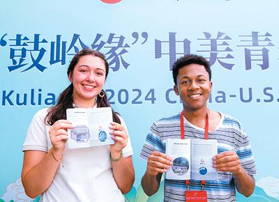 参加2024“鼓岭缘”中美青年交流周活动的两名学生代表展示在鼓岭“打卡”“盖章”。新华社记者 魏培全 摄