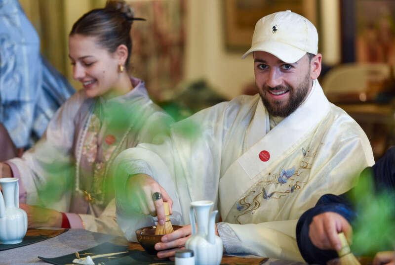 5月18日,新西兰奥克兰的民众在“茶和天下·雅集”活动上体验中国宋代点茶。